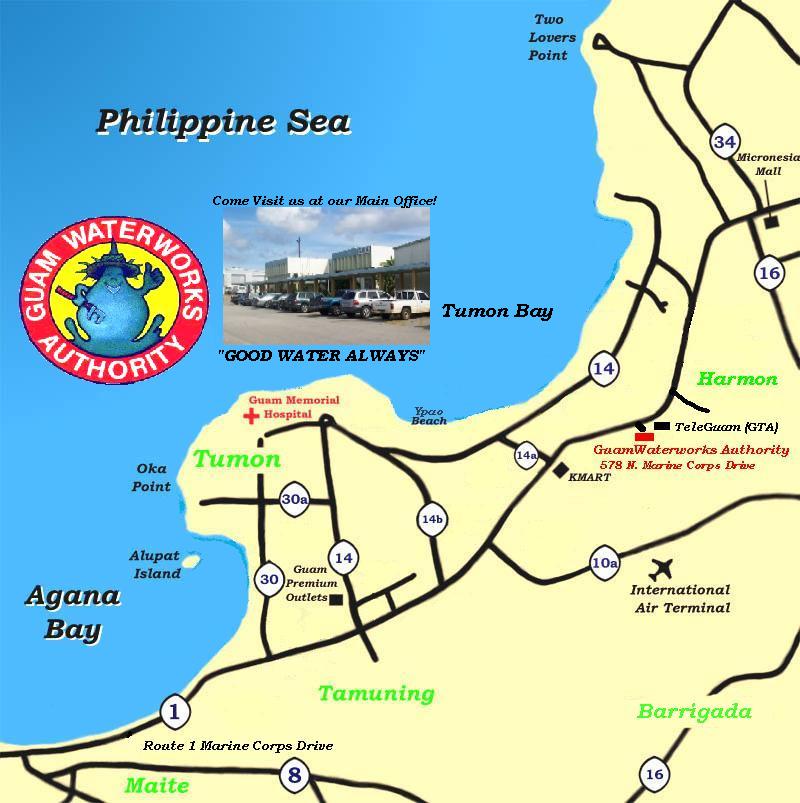 Guam Waterworks Office is located along Route 1, Upper Tumon behind TeleGuam and adjacent to Department of Puplic Works.